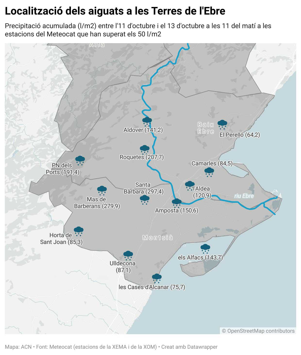 El temporal de pluges que segueix afectant les Terres de l’Ebre ha deixat registres de fins a 297,4 litres per metre quadrat a l’estació manual del Meteocat a Santa Bàrbara (Montsià) i 207,7 a l’Observatori de l’Ebre (Baix Ebre), entre dissabte i aquest dilluns a les onze del matí. Aquest és el valor més elevat registrat, juntament amb els de Mas de Barberans, de gairebé 280 litres de pluja acumulada, o els del Parc Natural dels Ports (Baix Ebre), de 191,4 i Amposta (Montsià), de 150,6. D’acord amb aquests registres, ja són vuit les estacions manuals i automàtiques del Servei Meteorològic de Catalunya de la zona que acumulen més de 120 litres/m2 al llarg del cap de setmana i fins avui a mig matí.