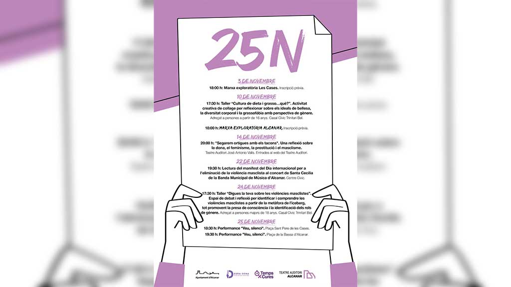 El dia 22, al concert de Santa Cecília de la Banda Municipal de Música d’Alcanar (19:30), es realitzarà la lectura del manifest del Dia Internacional per a l’Eliminació de la Violència Masclista. Les últimes activitats es duran a terme el dilluns 24 i el mateix dimarts 25. El dia 24, al Casal Cívic Trinitari Bel, es realitzarà el taller “Digues la teva sobre les violències masclistes” (17:30), un espai de debat i reflexió per identificar i comprendre les violències masclistes a partir de la metàfora de l’iceberg. El dia 25, finalment, s’oferirà la performance “Veu, silenci”, que es podrà gaudir tant a Les Cases (Plaça de Sant Pere, a les 18:30) com a Alcanar (Plaça de la Bassa, a les 19:30).