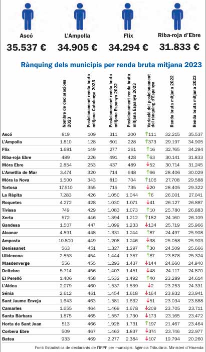 Fins ara, Flix encapçalava esta classificació, però ha baixat fins al tercer lloc, mentre que Riba-roja d’Ebre es manté en quarta posició. Móra d’Ebre i l’Ametlla de Mar completen el grup dels sis municipis ebrencs amb una renda bruta mitjana anual superior als 30.000 euros.