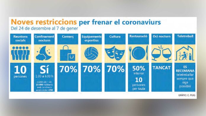 Sembla que el desgavell de restriccions donarà un final capicua a l’any 2021. I és que tot just fa un any, segons s’aproximaven les festes nadalenques, el Govern de la Generalitat va haver de fer un pas enrere en la fase de desescalada davant l’increment exponencial de casos positius per covid, i va instaurar tot un seguit de restriccions -Catalunya confinada perimetralment, confinaments nocturns que s’allargaven unes hores les nits de Nadal, Cap d’Any i Reis, certificats d’autoresponsabilitat justificant els desplaçaments, reunions amb 10 persones com a màxim, amb determinats sectors econòmics tancats i la restauració amb un horari limitat de les 7.30 h a les 9.30 h, de les 13 h a les 15.30 h, i només podien servir sopars per a recollir-los al local o a domicili-, per tal de fer front a la pandèmia, i restaven a l’espera de l’arribada de les vacunes, que s’havia de produir el 27 de desembre.