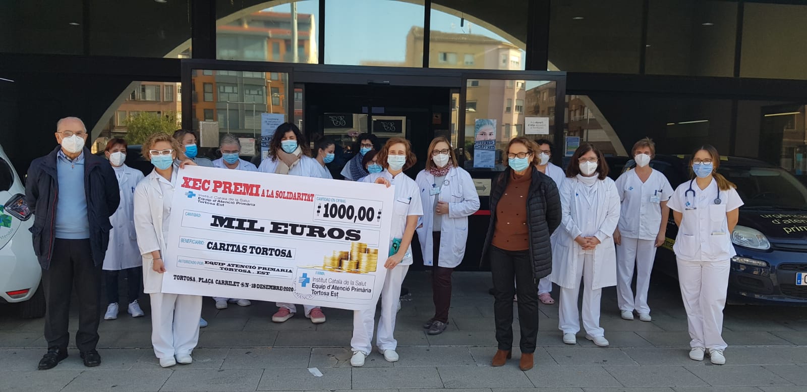 TORTOSA // Els treballadors i treballadores de l’Equip d’Atenció Primària Tortosa-Est, conegut popularment com el Cap del Temple, han fet el lliurament d’un taló de 1.000 euros a Càritas Tortosa en el que han vingut a denominar “xec premi a la solidaritat”. Es tracta en definitiva dels diners que en l’àmbit personal destinava tradicionalment el personal per fer el sopar de Nadal, i que per culpa de la pandèmia no podran dur a terme. Una acció solidària que anirà dirigida directament a una de les entitats que té cura de subministrar aliments a persones i famílies necessitades, i que arribarà des d’un sector que està a primera línia en la lluita contra el coronavirus. La doctora Anna Panisello, directora de l’equip, amb la resta de companys, va fer el lliurament del simbòlic taló a Lluís Pegueroles, president de Càritas Tortosa.