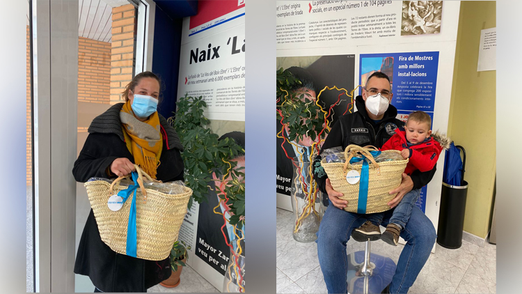 TERRES DE L’EBRE // La roquetera Carme Moya, i l’ampostí Francesc Lluís Vidal, ja tenen la seua cistella Caprabo després de recollir-la durant el matí d’avui a la redacció del Setmanari L’Ebre.