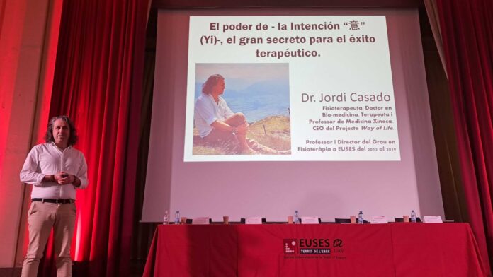 Durant l’acte central de la Jornada, el Dr. Jordi Casado, qui actualment viu i treballa a Suïssa, ha ofert la conferència sota el títol: “El poder de – la Intención “意” (Yi) – el gran secreto para el éxito terapéutico”. Casado, que porta anys formant-se i especialitzant-se en Medicina Tradicional Xinesa, ha obsequiat els assistents amb una sessió distesa, entretinguda i molt interessant sobre anar més enllà de les tècniques i els exercicis de fisioteràpia, per, a través de la intenció, l’empatia i la connexió amb el pacient, trobar la millor manera d’aplicar el tractament adient a cada cas. I és que, com tot a la vida, les coses que es fan des de l’amor i la passió acaben assolint grans resultats. A través de diverses històries, paràboles i exercicis, ha animat els nombrosos estudiants de la sala a anar més enllà dels coneixements acadèmics i tècnics, i ser oberts de ment per entendre cada persona i la seva patologia, i explorar des de la pròpia experiència sense prejudicis ni normes preestablertes. En definitiva, ha transmès als presents la seva gran passió per la seva professió. Per acabar, ha ofert un profund agraïment als qui van ser els seus companys de claustre durant la seva estada a EUSES, que ha emocionat tothom. La xerrada ha estat molt ben acollida pels assistents, que han ofert un gran aplaudiment a Casado. Un cop acabada, Xavier Nadal ha agraït Casado la seva participació amb l’obsequi d’una placa commemorativa.