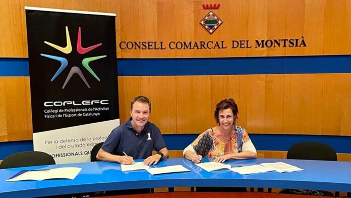 Mari Carmen Masià, presidenta del Consell Esportiu del Montsià, i Xavi Nadal, delegat territorial a l’Ebre del Col·legi de Professionals de l’Activitat Física i de l’Esport de Catalunya (COPLEFC) han signat un conveni de col·laboració per aconseguir millorar de manera conjunta els serveis esportius i de les activitats físiques que reben els ciutadans a la comarca.