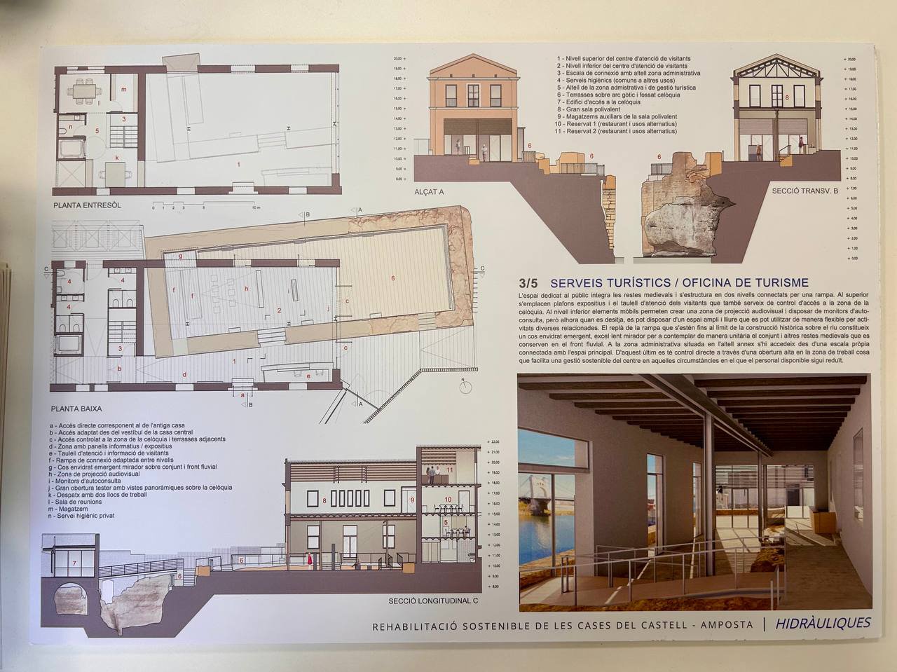 La proposta guanyadora, tal i com explicava un dels seus autors, Carles Brull, pretén compaginar la preservació i posada en valor de les tres cases amb les restes medievals que se sap que hi ha a sota de la més oriental. Així, es proposta que en aquesta casa, on s’ubicarà l’oficina de turisme, quedaran visibles les restes en un espai diàfan museïtzat i amb accés a la celòquia i els espais exteriors adjacents. Quant a la casa central, el seu vestíbul, que mantindrà l’ambient de les construccions originals, serà el punt de connexió entre àmbits, i donant accés directe a la cafeteria i als serveis destinats l’activitat cicloturística, situats a la casa més propera a la Biblioteca. És en aquesta casa on hi haurà la cafeteria i restaurant, amb una terrassa sobre el riu. La rehabilitació preveu, a més, criteris de restauració de tots aquells elements que sigui possible mantenir.