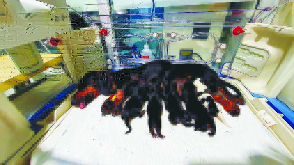 Una gossa amb la seua camada a l’Hospital Veterinari del Sud de Catalunya. / Foto: Cedida