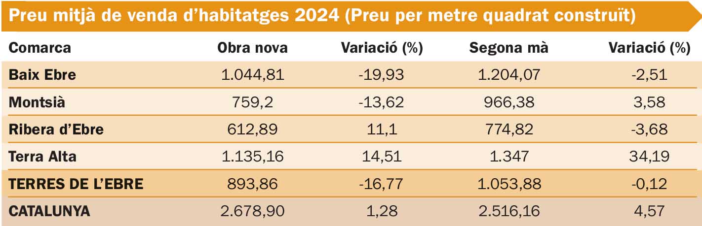 La regió de l’Ebre ha registrat un descens generalitzat en el preu de l’habitatge, tant d’obra nova com de segona mà, en contrast amb la tendència a l’alça que s’ha observat al conjunt de Catalunya durant el 2024. Segons les dades publicades per l’Institut d’Estadística de Catalunya (Idescat), el preu mitjà de l’obra nova a la regió de l’Ebre se situa en 893,86 €/m², un 16,77 % menys que l’any anterior, mentre que al conjunt del país creix un 1,28 % fins als 2.678,90 €/m². Pel que fa a l’habitatge de segona mà, el preu regional mitjà baixa lleugerament fins als 1.053,88 €/m² (-0,12 %), mentre que a Catalunya puja un 4,57 % i arriba als 2.516,16 €/m².
