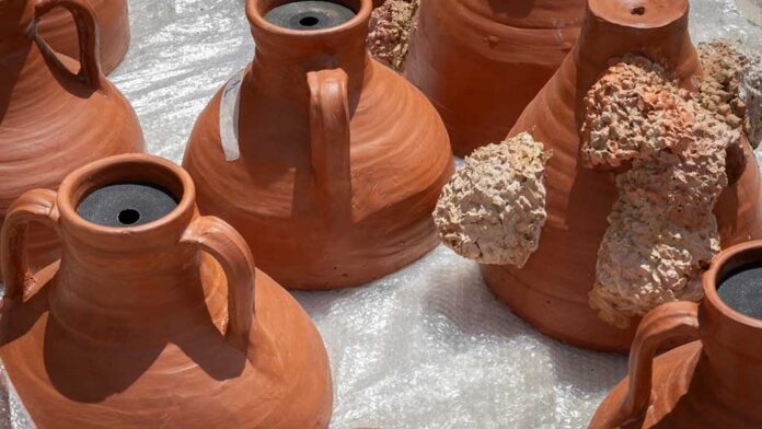 Els nius d’oreneta que es podran observar a la façana de Lo Pati estan fets amb fang local i colònies bacterianes que calcifiquen el temps i esdevenen dispositius interespècie que ens parlen de migracions, hàbitats compartits i vincles que no passen per la utilitat sinó per la cura. Les argiles, transformades en nius, s’incrusten en càntirs tornejats amb fang comercial, deixant entreveure la tensió entre el que se sosté i el que es dissol. Amb la col·laboració de la Terrisseria de Mravet Ferran Segarra.