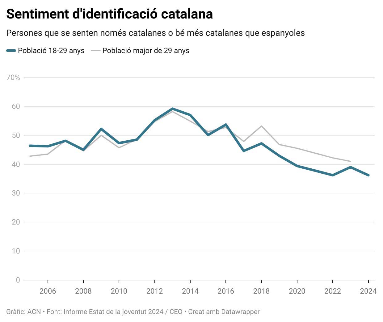 Els joves que se senten exclusivament catalans o més catalans que espanyols han caigut més de 20 punts en només una dècada. Si l’any 2014, coincidint amb la consulta del 9-N, el sentiment d’identificació catalana era del 57% entre les persones de 16 a 29 anys, ara ha caigut fins al 36,2%, segons l’informe sobre l’estat de la joventut 2024 presentat aquest divendres per l’Agència Catalana de la Joventut. D’altra banda, la taxa d’emancipació juvenil se situa en el 17,4%, una caiguda de vuit punts respecte a fa una dècada, i pràcticament la meitat respecte als nivells previs a la crisi del 2008 (32,6%). Alhora, les dades revelen que l’abandonament escolar prematur està en nivells mínims des de, com a mínim, inicis de segle, i ara és del 13,7%.
