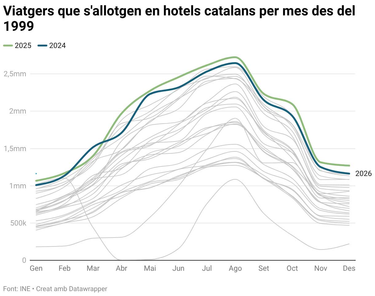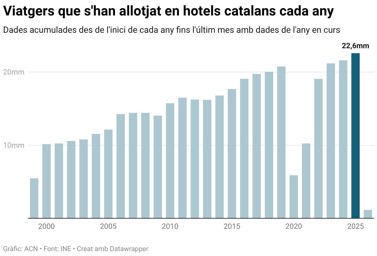 Els hotels catalans van marcar la millor dada de la sèrie històrica (amb dades des de 1999) en un mes de gener en allotjar 1.162.644 viatgers, un 9% més en comparació al mateix període del 2025. Les dades provisionals de la sèrie històrica de la Conjuntura Turística Hotelera de l’Institut Nacional d’Estadística (INE) també confirmen que el nombre de pernoctacions ha crescut un 8,09% interanual fins a les 2.589.074, d’aquestes 1.727.307 representen viatgers estrangers i 841.766 són usuaris de l’Estat. La xifra segueix la tendència de rècord registrada durant 2025, excepte al març, quan va haver-hi una davallada en comparació al 2024.