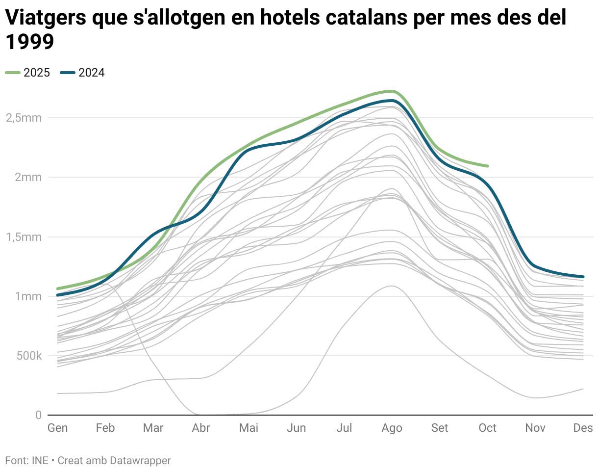 És la tercera vegada aquest 2025 que el nombre de persones allotjades i les pernoctacions van coincidir en marcar un màxim mensual. Les altres dues vegades van donar-se al gener, amb 1.063.163 d’usuaris i 2.392.888 de nits, i a l’abril, amb 1.969.774 d’hostes i 4.990.114 de pernoctacions.