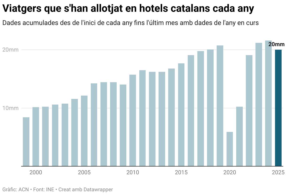 El nombre de viatgers allotjats en hotels catalans van superar per primera vegada els dos milions de clients en un mes d’octubre (2.094.477), segons les dades provisionals de la sèrie històrica de la Conjuntura Turística Hotelera de l’Institut Nacional d’Estadística (INE) (amb dades des de 1999). La xifra d’usuaris va suposar un 8,18% més respecte al mateix mes del 2024, impulsada pel creixement del visitant de l’Estat amb un 10,87% interanual més (674.991). Per la seva part, els estrangers, que van representar pràcticament el 70% del total, van augmentar un 6,94% (1.419.486). D’altra banda, les pernoctacions van marcar un rècord en un mes d’octubre amb 5.417.015, un 3,74% més en comparació amb el mateix període de fa un any.