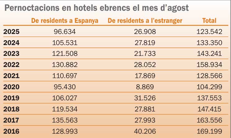 Els hotels de les Terres de l’Ebre han registrat este agost el nombre més baix de pernoctacions dels últims deu anys —amb l’única excepció del 2020, marcat per la pandèmia de la covid-19. Així ho indiquen les dades de l’Estadística de Conjuntura Hotelera fetes públiques esta setmana per l’INE.