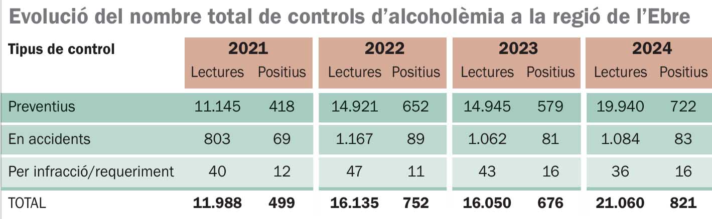 Les proves d’alcoholèmia han seguit una tendència clarament a l’alça a les Terres de l’Ebre en els últims cinc anys. El 2020, l’any de la pandèmia de la covid-19, se van practicar 6.888 lectures, amb 247 positius. Des d’aleshores, les xifres han anat creixent. El 2021 es van realitzar 11.988 proves (499 positius), el 2022 se va arribar a 16.135 (752), el 2023 se va mantindre un volum similar amb 16.052 (676) i el 2024 se’n van fer 21.060 (821).