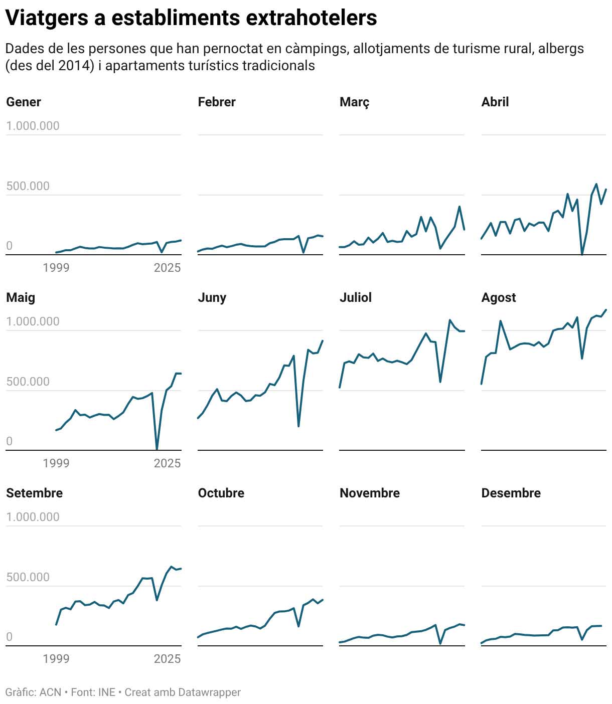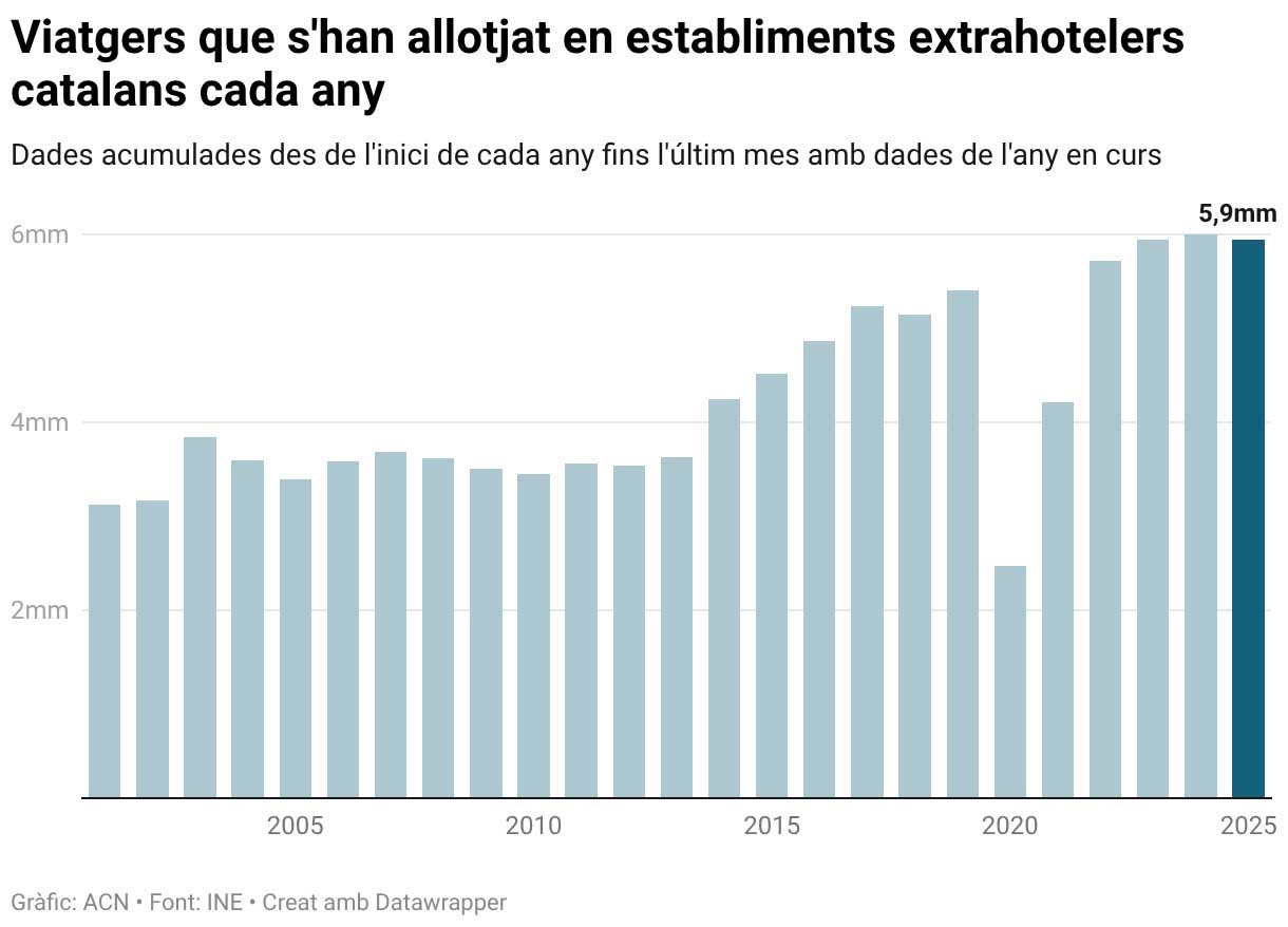 El nombre d’usuaris en allotjaments extrahotelers (apartaments turístics i rurals, càmpings i albergs) va disminuir un 3,93% al novembre en comparació amb el mateix mes del 2024, fins a 172.792, segons les dades provisionals publicades per l’Institut Nacional d’Estadística (INE). Es tracta del cinquè mes del 2025 amb variació interanual negativa, després de febrer (4,55%), març (47,69%), maig (0,22%) i juliol (0,05%). Les pernoctacions també van patir una davallada, que va ser del 4,85% respecte a l’onzè mes de l’any anterior, situant-se en 526.790. Tot i això, segueix per sobre del mig milió, que va assolir per primera vegada el 2024. D’altra banda, l’estada mitjana va pràcticament ser la mateixa que fa un any, de 3,05 dies.