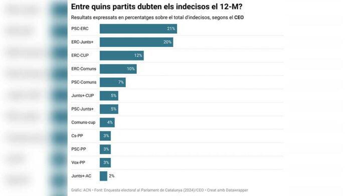 També hi ha un 7% dels indecisos que estan entre PSC i els Comuns, un 5% entre Junts i la Cup, i també un 4% que dubta entre votar Comuns o la CUP. A més distància, un 2% dels indecisos es debaten entre Junts i Aliança Catalana, partit que podria irrompre al Parlament (0-2 escons) segons l’Enquesta publicada aquest divendres