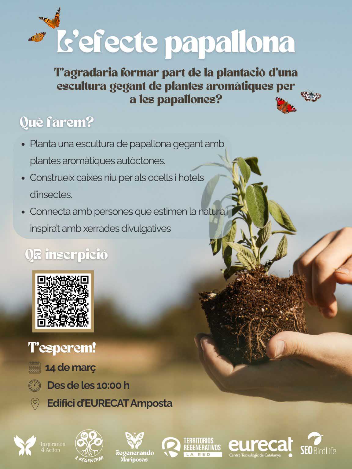 El centre tecnològic Eurecat Amposta serà el punt de partida de la iniciativa L’Efecte Papallona, el pròxim 14 de març, amb la creació de la primera gran escultura de plantes aromàtiques autòctones per a les papallones i altres pol·linitzadors, dins d’una jornada d’activitats regeneratives organitzada pel Centre en Resiliència Climàtica d’Eurecat i les entitats A Regenerar, Inspiration 4 Action, SEO/BirdLife i la Red de Territorios Regenerativos.