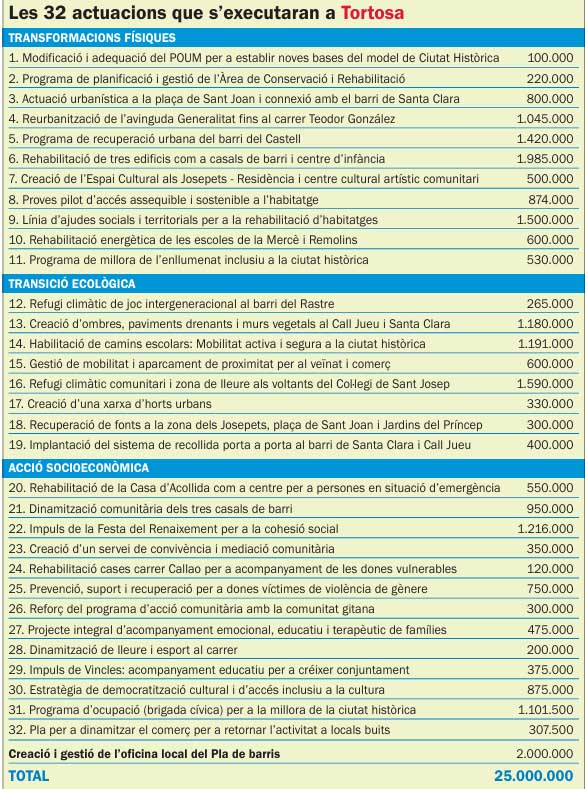 En el cas de Tortosa, el primer eix, centrat en les transformacions físiques, preveu 11 actuacions amb un pressupost de 9,5 milions d’euros. Destaquen la modificació del POUM de 2007 per a adaptar-lo a la realitat actual del nucli antic; la reurbanització del primer tram de l’avinguda de la Generalitat, entre el Pont de l’Estat i el carrer Teodor González, i la recuperació del barri del Castell mitjançant enderrocs i l’adquisició d’habitatges en estat ruïnós per a facilitar futures promocions d’habitatge públic. També s’hi inclou la rehabilitació d’edificis històrics com l’antiga església de Sant Joan, el Centre Multiusos de Remolins i el centre Sant Francesc, que es transformaran en casals de barri i centre d’infància, així com la conversió del conjunt dels Josepets en un centre d’art i residència d’artistes. En l’àmbit de l’habitatge, es preveuen programes pilot de rehabilitació urbana, ajuts a petits propietaris de fins al 50 % del cost de les obres, la rehabilitació energètica de les escoles de la Mercè i Remolins i la millora de l’enllumenat públic.