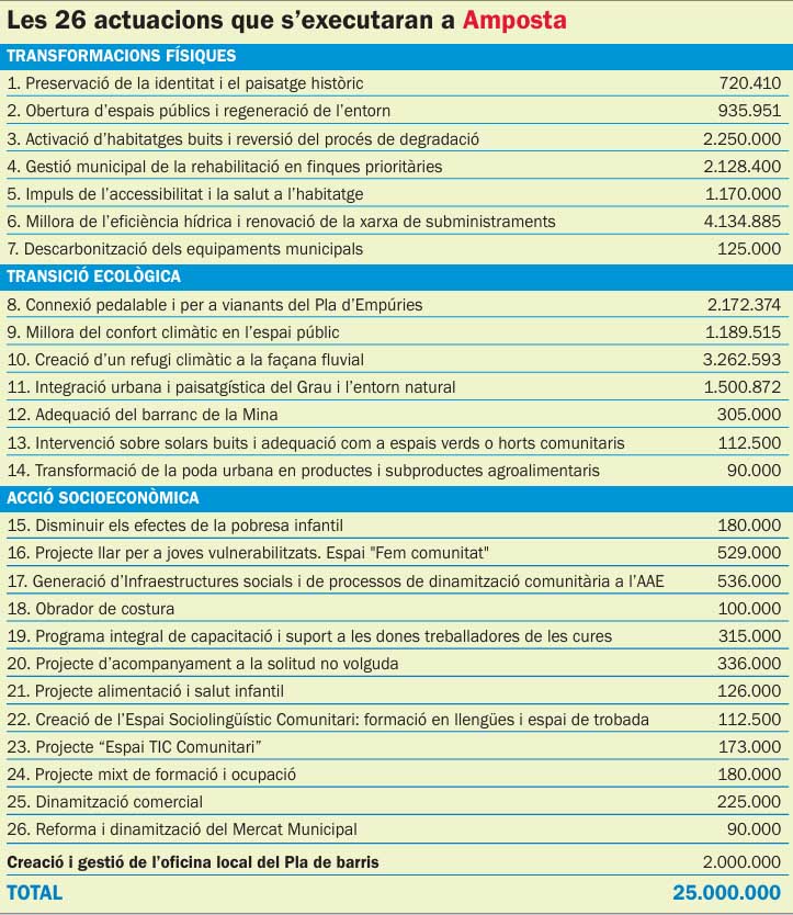 Amb l’ajut concedit, l’Ajuntament d’Amposta preveu desplegar un ampli projecte de transformació urbana amb l’objectiu de recuperar la façana fluvial i millorar l’habitabilitat als barris de la Vila, el Grau i el Pla d’Empúries [Vegeu totes les actuacions en el quadre adjunt].