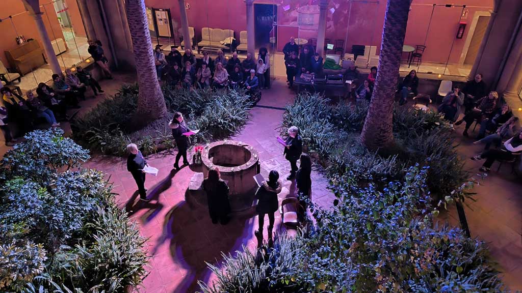 L’acte va comptar amb la presència de l’actriu jesusenca Gemma Ginovart i va tenir com a protagonistes un grapat de poemes que les actrius van anar recitant, primer des de les finestres del primer pis de l’edifici i, després, des del Claustre. Hi van ressonar Maria Mercè Marçal, Frida Khalo, Montserrat Abelló… per tal de reivindicar la veu de moltes dones silenciades i maltractades.