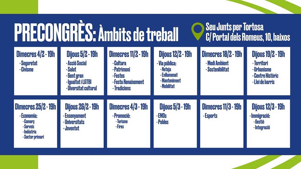 Les sessions es faran totes a les 19h a la seu de Junts per Tortosa, al carrer Portal dels Romeus, 10 baixos, i s’aniran desenvolupant entre el 4 de febrer i el 12 de març, segons el calendari establert.