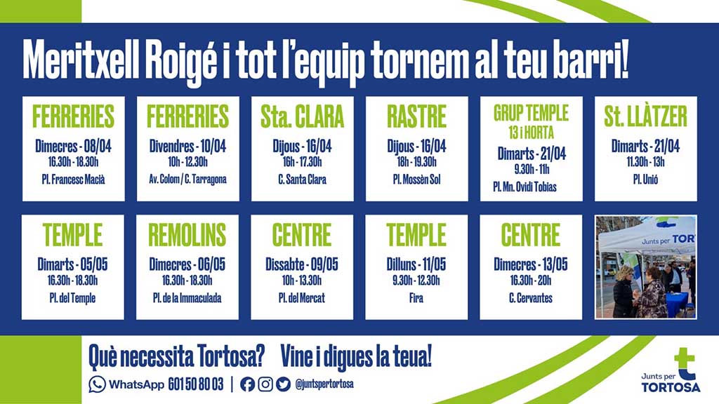 L’equip de Junts per Tortosa visitarà els barris de Ferreries el 8 i 10 d’abril; el Rastre i Santa Clara el 16 d’abril; el Grup del Temple el 21 d’abril; Sant Llàtzer el 21 d’abril; el Temple el 5 i 11 de maig; Remolins el 6 de maig; i el Centre el 9 i el 13 de maig.