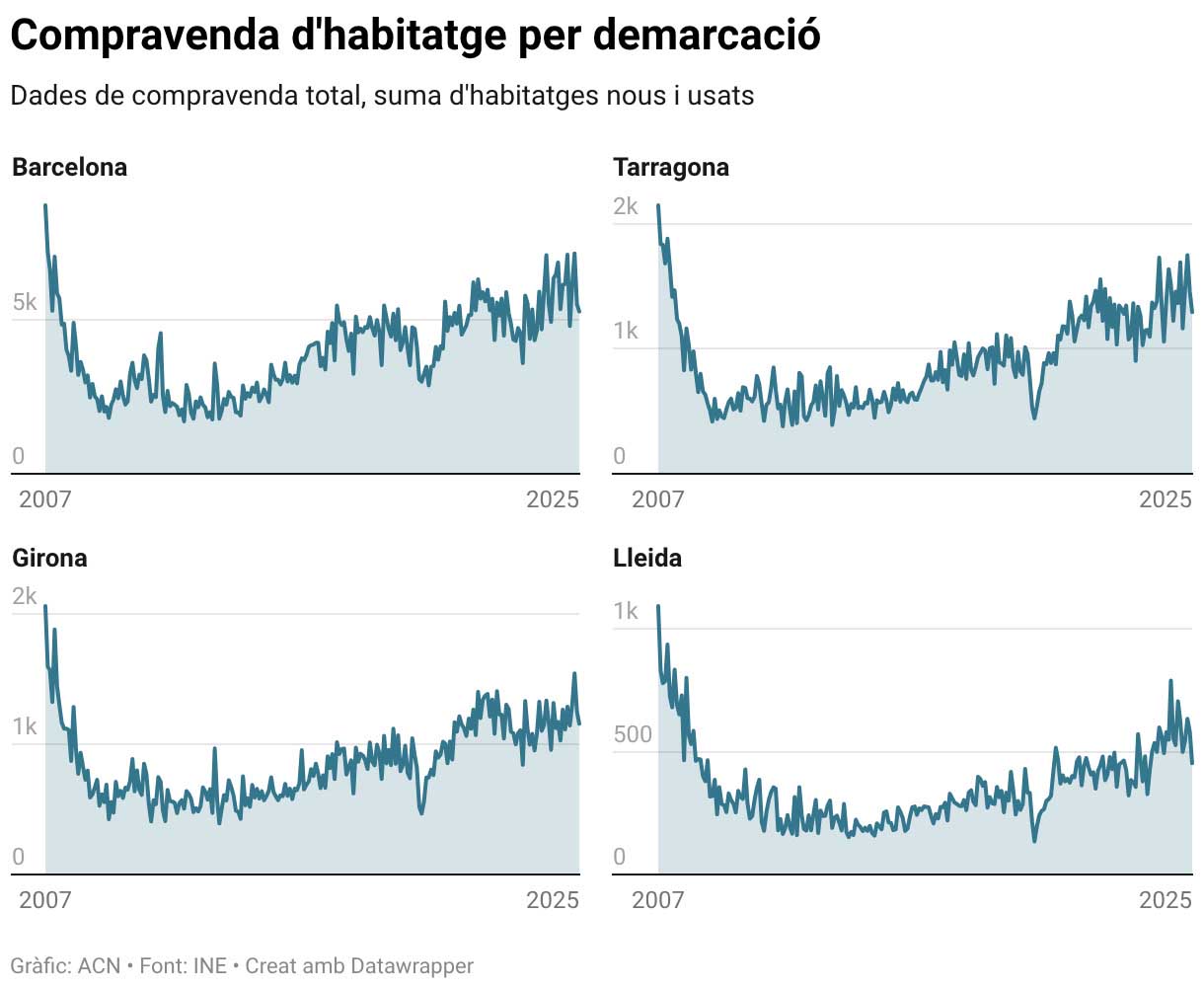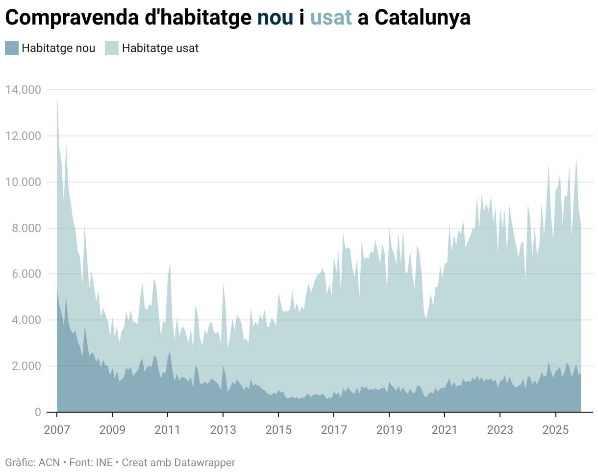 La compravenda d’habitatges va tancar el 2025 amb 112.585 operacions, un 13,9% més que el mateix període de l’any passat, segons l’Estadística de Transmissions de Drets de la Propietat de l’Institut Nacional d’Estadística (INE). D’altra banda, el mercat va registrar el millor mes de desembre des del 2007, amb 8.181 operacions, un 9,9% interanual més. En comparació amb el mes de novembre, però, les operacions van baixar un 6,97%. Per demarcacions, Barcelona va concentrar 5.278 operacions al desembre, un 6,95% més que un any enrere. Girona (1.158) i Tarragona (1.292) van encapçalar els increments, amb pujades del 20,9% i del 22,2%, respectivament. Lleida va ser l’única província amb una evolució negativa (-8,3%), amb 453 compravendes.