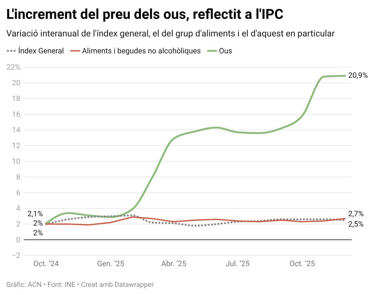 Per productes, respecte de l’any passat el que s’ha disparat més de preu són els ous (+20,9%), que arrossega augments de més del 20% per segon mes consecutiu. L’increment es troba 17,8 punts per sobre de la variació registrada el desembre del 2024 (+3,1%). La xifra és la segona més alta en vint anys, només superada pel 21,3% del desembre del 2022.