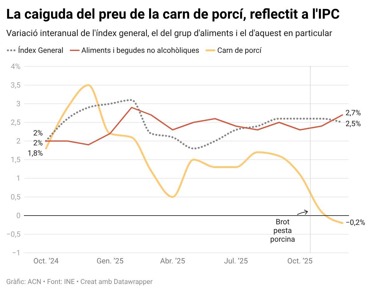 D’altra banda, les dades publicades aquest dijous per l’INE també reflecteixen una caiguda interanual del preu de la carn de porcí del 0,2% el mes de desembre. La xifra se situa en nombres negatius per primera vegada en quatre anys i coincideix amb el brot de pesta porcina africana.