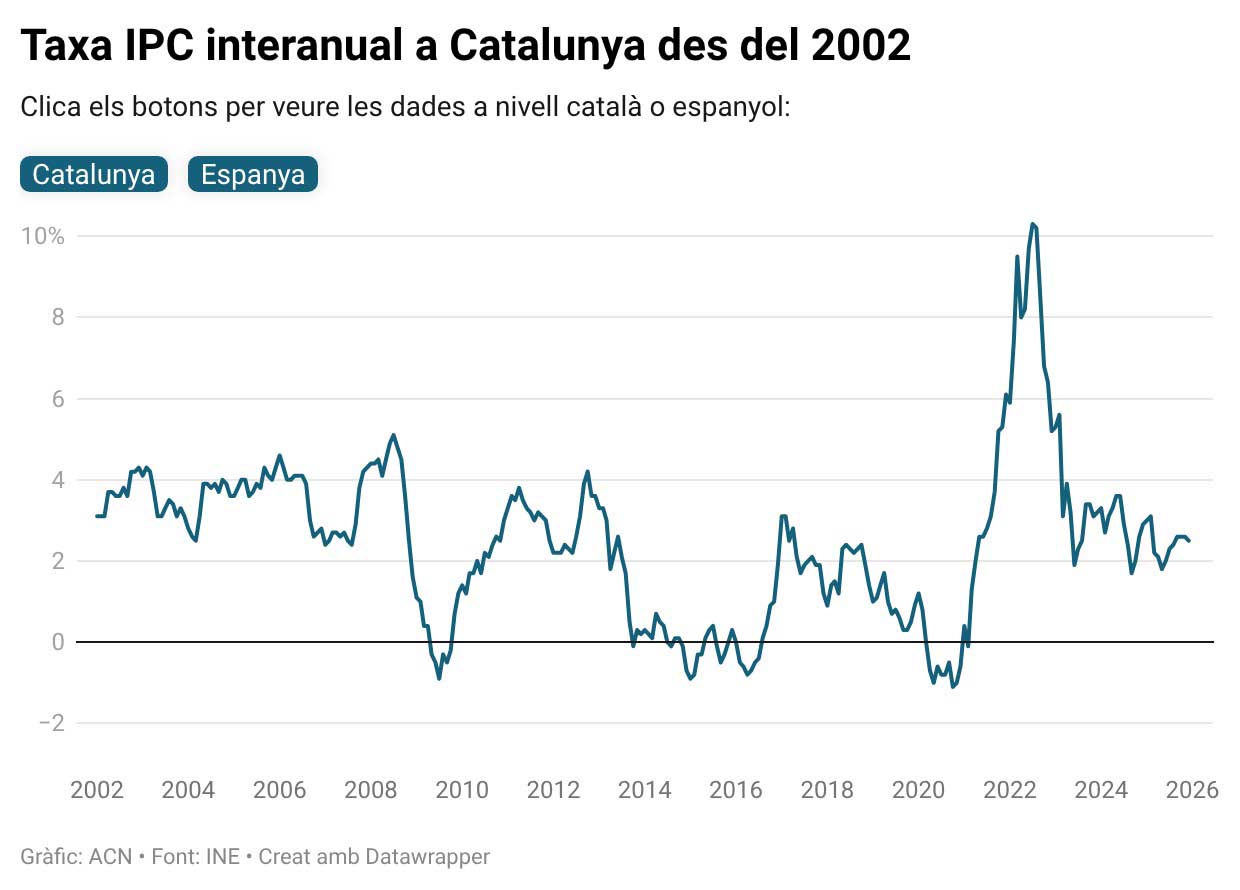 Catalunya acaba el 2025 amb una inflació cinc dècimes per sota de la del primer mes de l’any (3%) i amb un indicador que és el segon més baix de les comunitats autònomes, només superada per Múrcia (+2,4%). Així doncs, la inflació ha finalitzat el 2025 quatre punts per sota de la mitjana estatal (2,9%).