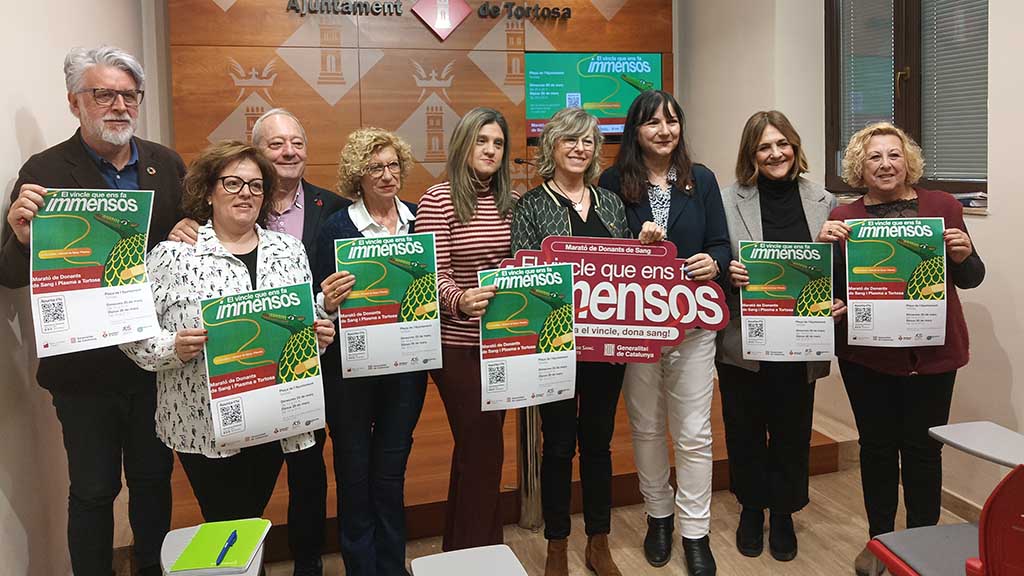 El proper dimecres, 25 de març, es donarà el tret de sortida a la campanya de donació de sang i plasma més gran de l’any, que s’allargarà fins al dijous 26. En el cas de Tortosa, com l’any passat, la seu de la donació serà en una carpa instal·lada a la plaça de l’Ajuntament. Serà en horari de 15 a 21 hores el dimecres, i de 10 a 21 hores el dijous. “El cartell de crida està protagonitzat per la Cucafera, que també se suma a la donació“, ha explicat l’alcaldessa de Tortosa, Mar Lleixà. “Sota el lema ‘El vincle que ens fa immensos’, la Marató de Donants de Sang d’enguany posa el focus en este gest solidari i altruista, que és donar sang, i que ens fa immensos com a persones“, ha afegit Lleixà, qui ha comparegut acompanyada per la regidora de Salut, Sònia Rupérez; la coordinadora del Banc de Sang i Teixits a la demarcació de Tarragona, Núria Vilanova, i el president de l’Associació de Donants del Baix Ebre, Francesc Bertomeu.