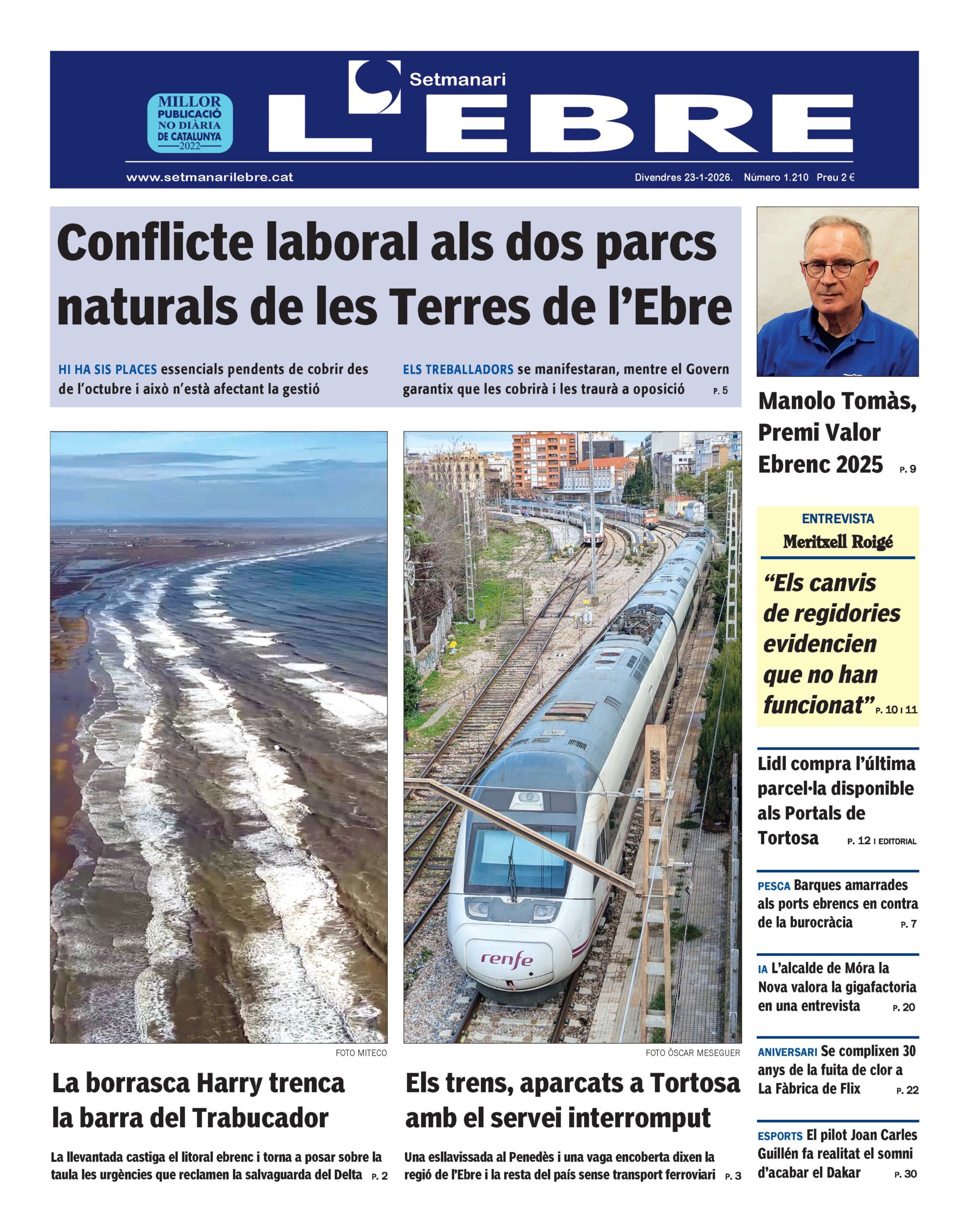 La portada inclou dos fotos verticals destacades: la barra del Trabucador inundada, a conseqüència del temporal Harry, i trens aturats a l’estació de Tortosa, a conseqüència de la interrupció total del servei des de la matinada de dimecres.