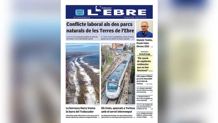La portada inclou dos fotos verticals destacades: la barra del Trabucador inundada, a conseqüència del temporal Harry, i trens aturats a l’estació de Tortosa, a conseqüència de la interrupció total del servei des de la matinada de dimecres.