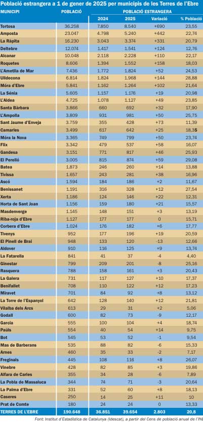 D’altra banda, la proporció de població nascuda a l’estranger resident a les Terres de l’Ebre ha crescut un punt i mig en l’últim any i, a 1 de gener de 2025, se situa en el 23,5 %. Este percentatge inclou també les persones d’origen estranger que han adquirit la nacionalitat espanyola. Per comarques, però, la distribució és desigual. Al Baix Ebre, la població nascuda a l’estranger ja representa el 24,4 % del total (1,5 punts més que un any abans); al Montsià, el 24,1 % (+1,5); a la Ribera d’Ebre, el 21,2 % (+1,4); i a la Terra Alta, el 16,6 % (+0,9).