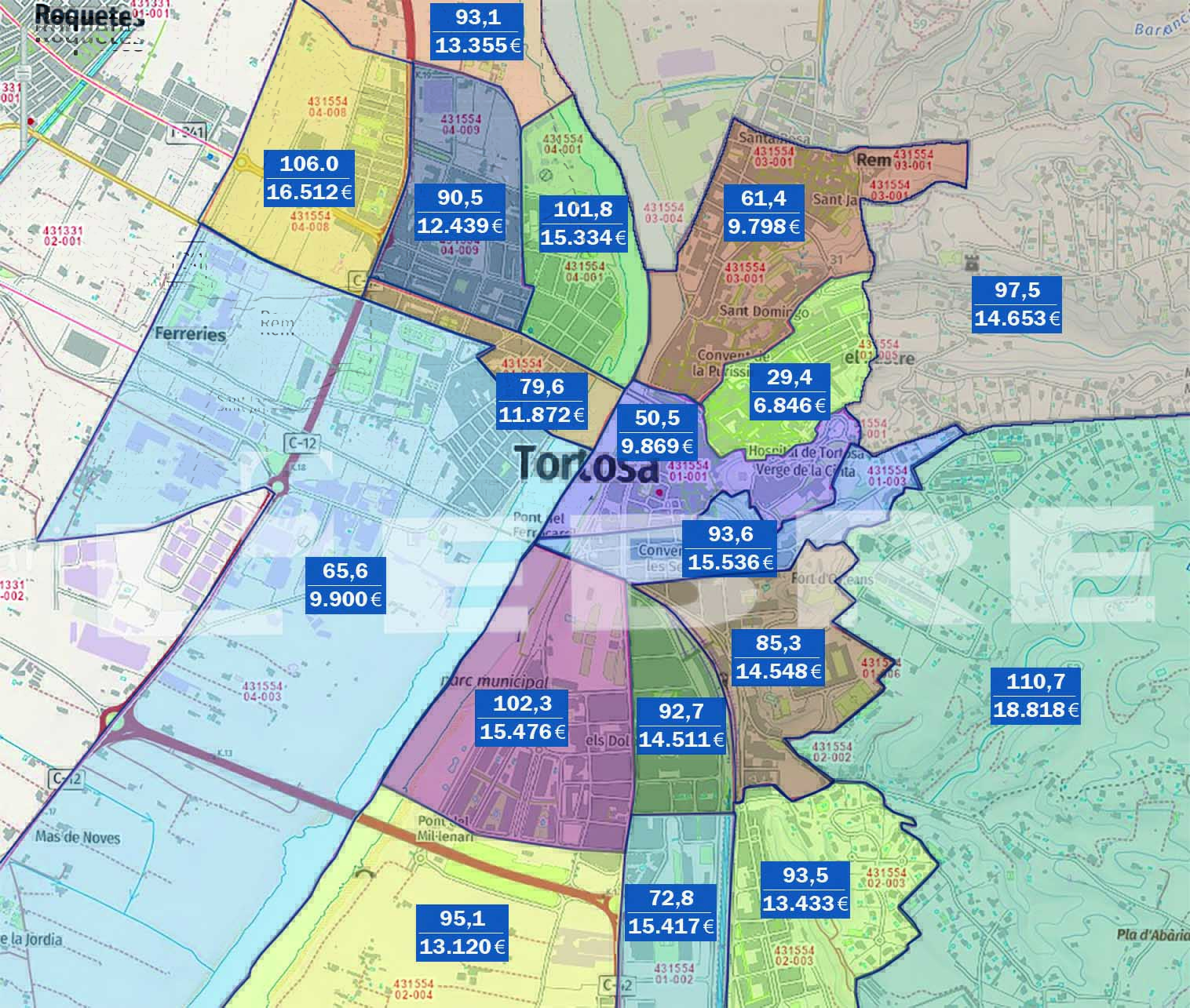 Les 23 unitats censals del municipi de Tortosa es distribuïxen en tres grans agrupacions. La primera inclou els barris situats dins les antigues muralles medievals i la zona de la Casota, a Ferreries. Les altres dos engloben, respectivament, la part del municipi situada a la riba dreta de l’Ebre (oest) i la de l’esquerra (est). Esta divisió simplificada permet constatar les desigualtats entre la ciutat històrica i la més moderna, desenvolupada a banda i banda del riu.