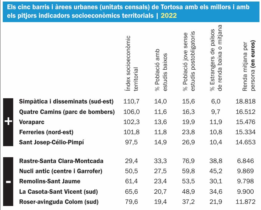 L’IST publicat fa una setmana per l’Idescat posa de manifest les grans desigualtats econòmiques i socials actuals entre els diferents barris del municipi. Els veïns del Rastre i Santa Clara, la Tortosa pobra, tenen una renda mitjana anual de només 6.846 euros, la més baixa del municipi, poc més d’un terç de la que perceben els residents a la urbanització de la Simpàtica i els disseminats del sud-est, on la renda mitjana per persona arriba als 18.818 euros, la més alta de la capital del Baix Ebre.