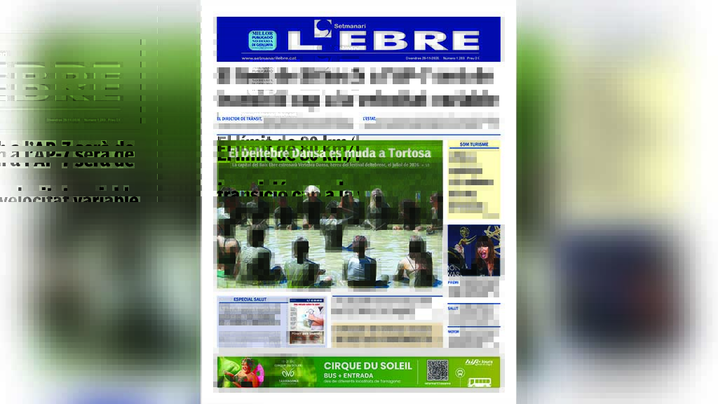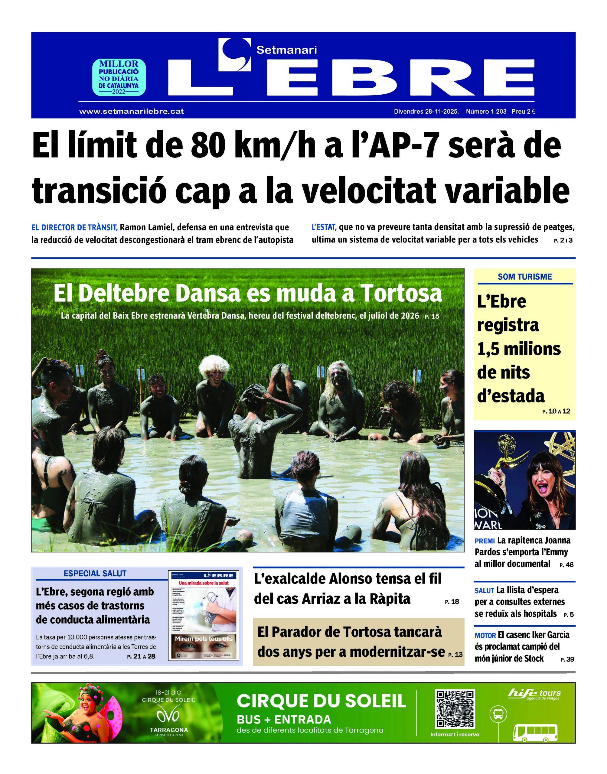 La portada de l’edició en paper número 1.203 del Setmanari l’Ebre dedica el titular principal de portada a una entrevista amb el director del Servei Català de Trànsit, Ramon Lamiel, que explica que el Ministeri de Transports accelera per a la implantació d’un sistema de velocitat variable al tram ebrenc de l’autopista, que agafarà el relleu de la limitació a 80 km/h per als camions i de 100 km/h per als turismes que és a punt d’entrar en vigor.
