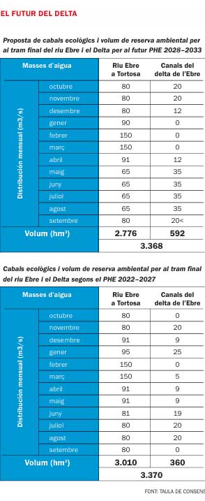 La Taula de Consens del Delta, integrada per les comunitats de regants i ajuntaments del delta de l’Ebre, ha proposat a la Confederació Hidrogràfica de l’Ebre (CHE), amb vista al nou període de planificació hidrològica 2028–33, una reducció del cabal ecològic del tram final del riu Ebre per als mesos de maig, juny, juliol i agost, per a garantir en cas de sequera l’aigua que baixa pels canals de reg quan el conreu de l’arròs en necessita més. La mesura blindaria d’esta manera un sector estratègic al territori, després que el 2023 la CHE restringís per primera vegada a la mitat l’aigua de reg en plena sequera. L’argument, però, va més enllà de l’agronòmic, ja que la Taula defensa que la reducció del cabal mínim del riu, dels 80 m3/s als 65 m3/s durant la part final de la primavera i l’estiu, ha de permetre garantir un cabal mínim dels canals de reg que, a més a més d’alimentar els arrossars, acaba nodrint d’aigua dolça les badies i les llacunes, espais d’alt valor ecològic per la seua biodiversitat. Concretament, la Taula de Consens proposa que entre maig i agost, el cabal mensual ecològic total dels dos canals —el de la dreta i el de l’esquerra— aporte al Delta almenys 35 m3/s, quan fins ara, sense estar fixat amb caràcter normatiu, se situaria implícitament entre els 9 m3/s del maig i els 20 m3/s de l’agost, segons la documentació aportada per la Taula a l’Esquema de Temes Importants del Pla Hidrològic de la conca de l’Ebre (PHE) 2028–33, que es va publicar el mes de novembre passat.
