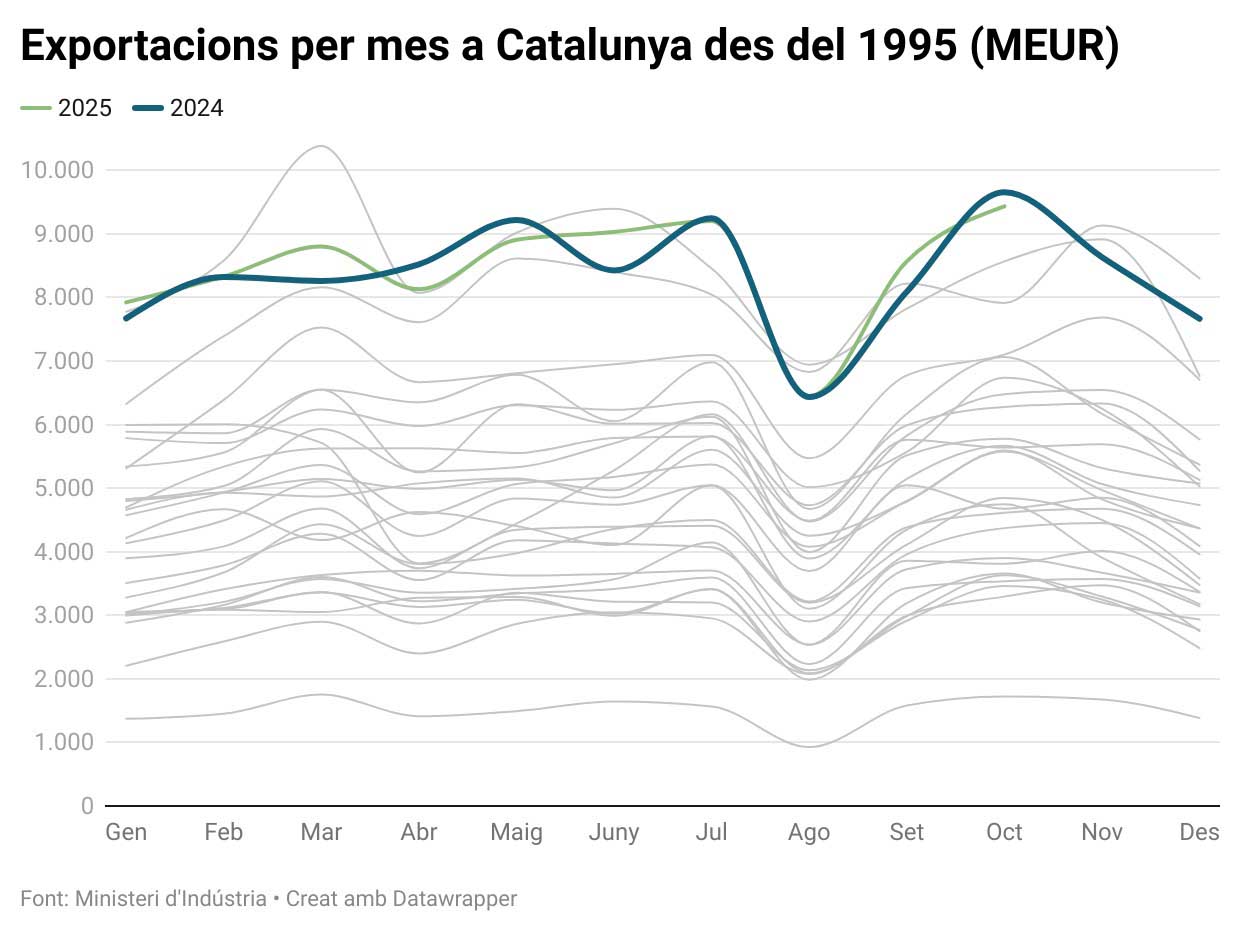 Les exportacions catalanes es van reduir un 2,3% a l’octubre en comparació amb el mateix mes de l’any passat i es van situar en els 9.433,2 milions d’euros, segons el Ministeri d’Economia, Comerç i Empresa. Tot i el descens interanual, és la tercera xifra més elevada des de març del 2023 (9.652,4 l’octubre del 2024 i 10.381,70 el març del 2023). Els efectes dels aranzels dels Estats Units van continuar per tercer mes consecutiu en el desè mes de l’any, amb una rebaixa de les vendes de béns catalans del 3,9%, fins a 370,1 milions d’euros. De fet, al global del continent americà les exportacions van caure un 16,7%. Per la seva part, les importacions també van patir una davallada del 5,7%, fins a 9.866,8 milions.