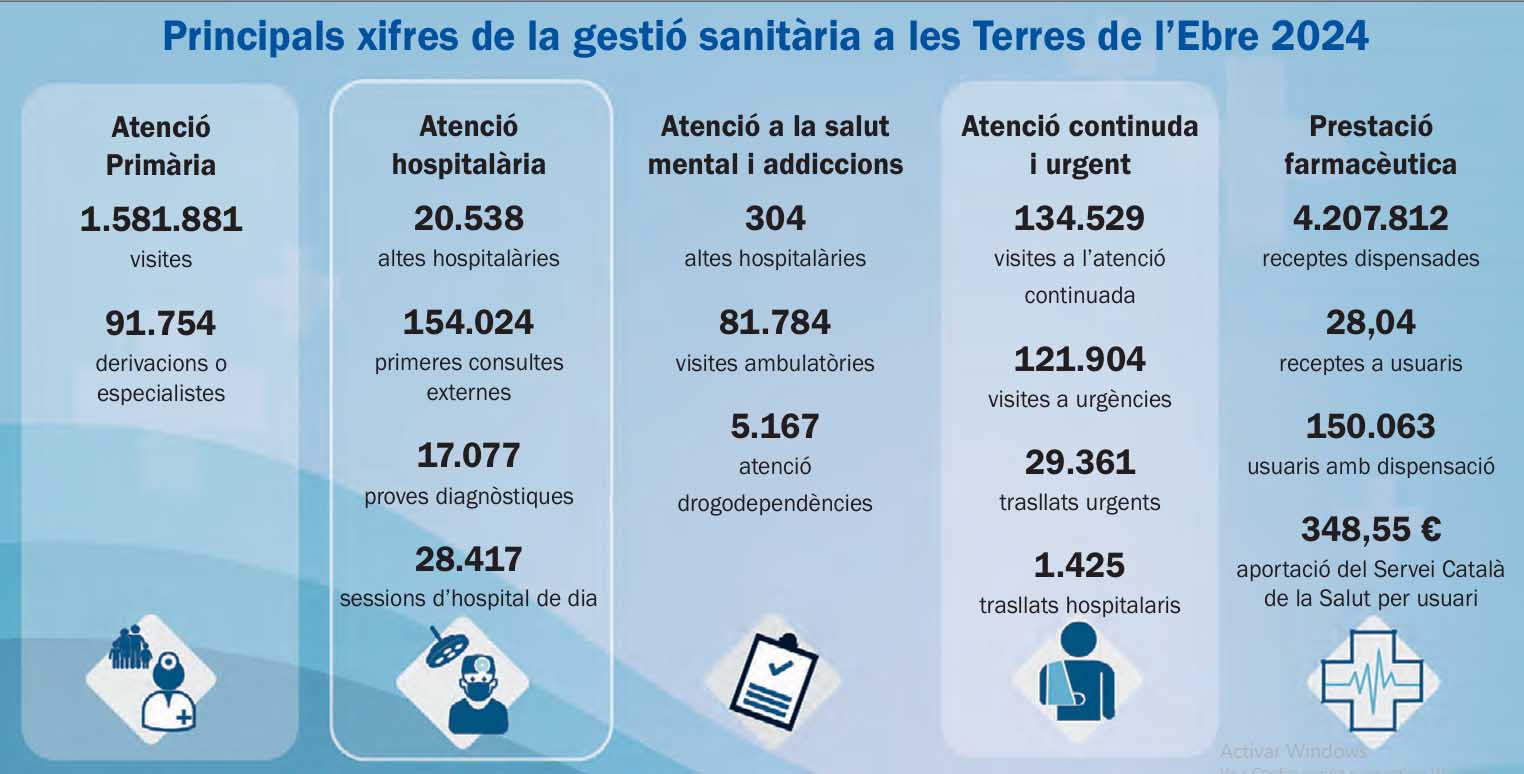 Estes dades consten a la memòria de 2024 que acaba de publicar el Servei Català de la Salut (CatSalut). L’organisme públic que gestiona i coordina el sistema sanitari de Catalunya va destinar l’any passat 335,52 milions d’euros a la Regió Sanitària ebrenca, un increment de l’11,1 % respecte al 2023. La major part d’esta despesa, un 59 %, se va concentrar en l’atenció especialitzada, mentre que l’atenció primària va absorbir prop d’una quarta part del total. Dins d’este àmbit, un 12 % va correspondre a despesa farmacèutica.