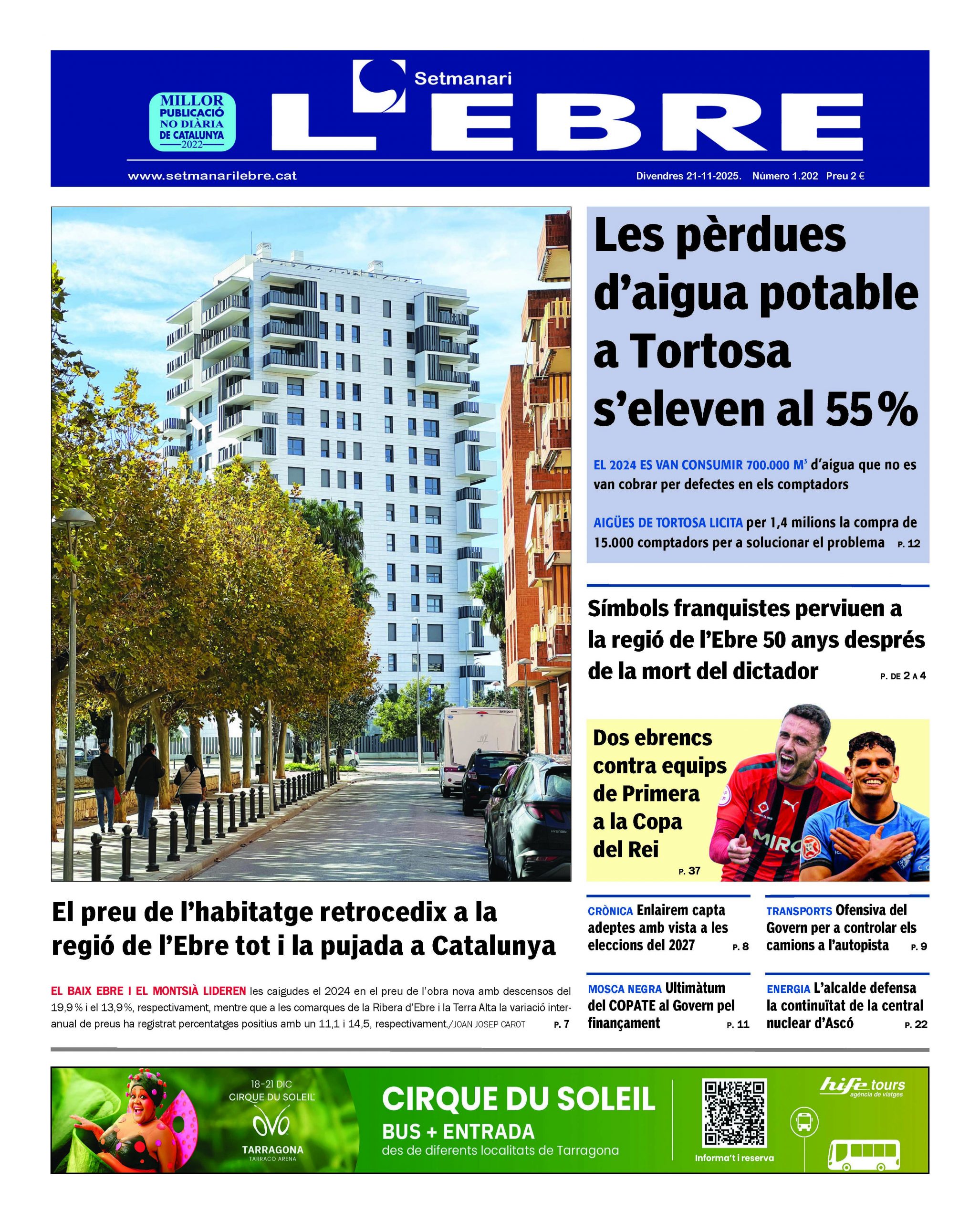 La portada de l’edició en paper del Setmanari l’Ebre número 1202 dedica el titular principal de portada a l’increment de les pèrdues d’aigua potable a la xarxa de Tortosa, que ja s’eleven fins al 55 % i que no totes són causades per fuites, ja que el 2024 es van arribar a consumir 700.000 metres cúbics que no es van cobrar per defectes en els comptadors. Aigües de Tortosa haurà d’instal·lar 15.000 comptadors nous per a resoldre esta part del problema.