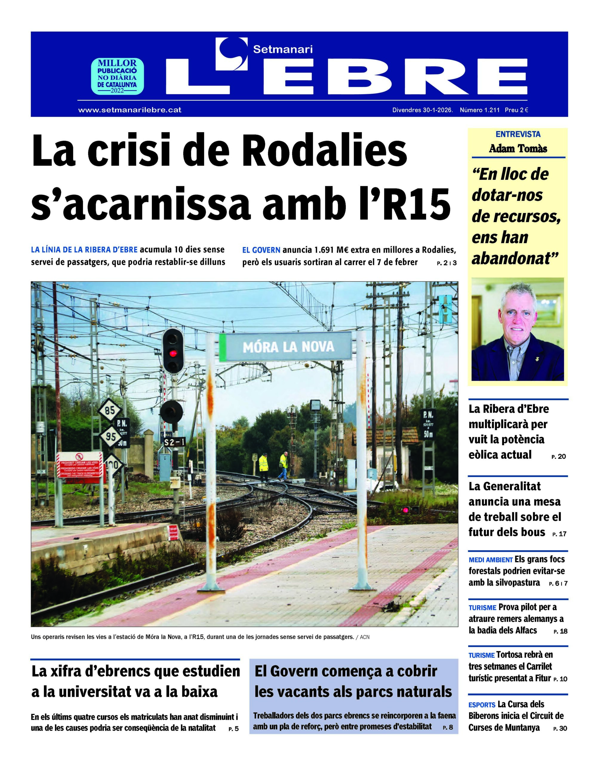 La portada de l’edició en paper número 1211 del Setmanari l’Ebre dedica el titular i la imatge principals de portada a la crisi ferroviària que sacseja tot el país, però que ha tornat a posar en el focus la debilitat i la precarietat de la línia de regionals R15, la que enllaça amb la Ribera d’Ebre, on ja fa 10 dies que no circula cap servei de passatgers entre Reus i Riba-roja d’Ebre. La imatge és de l’estació de Móra la Nova.