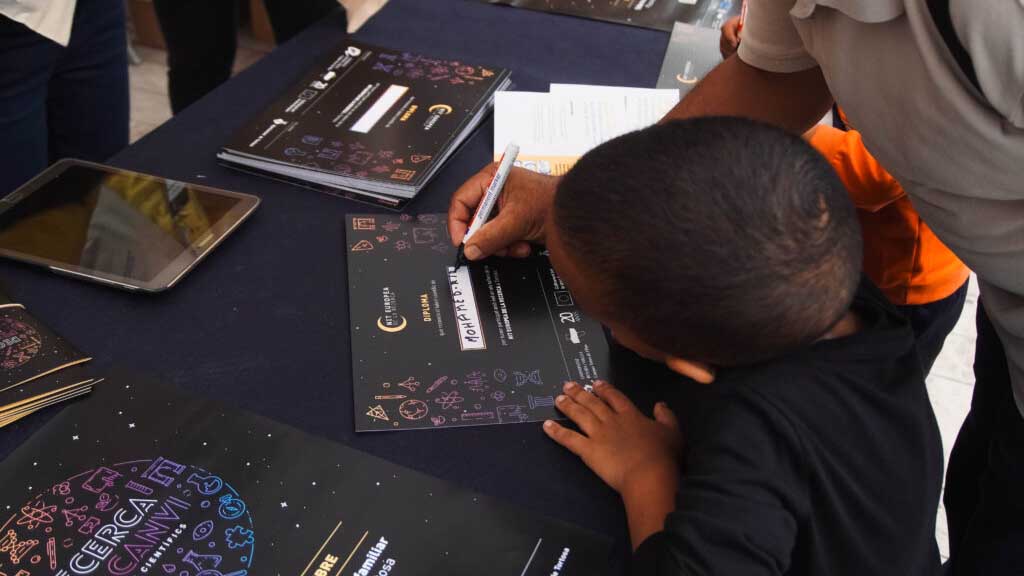 A l’entrada de la fira els nens i nenes rebien un passaport científic que podien completar participant als tallers, on tenien contacte directe amb investigadores i investigadors amb ganes de traslladar el seu coneixement d’una forma lúdica i experimental.