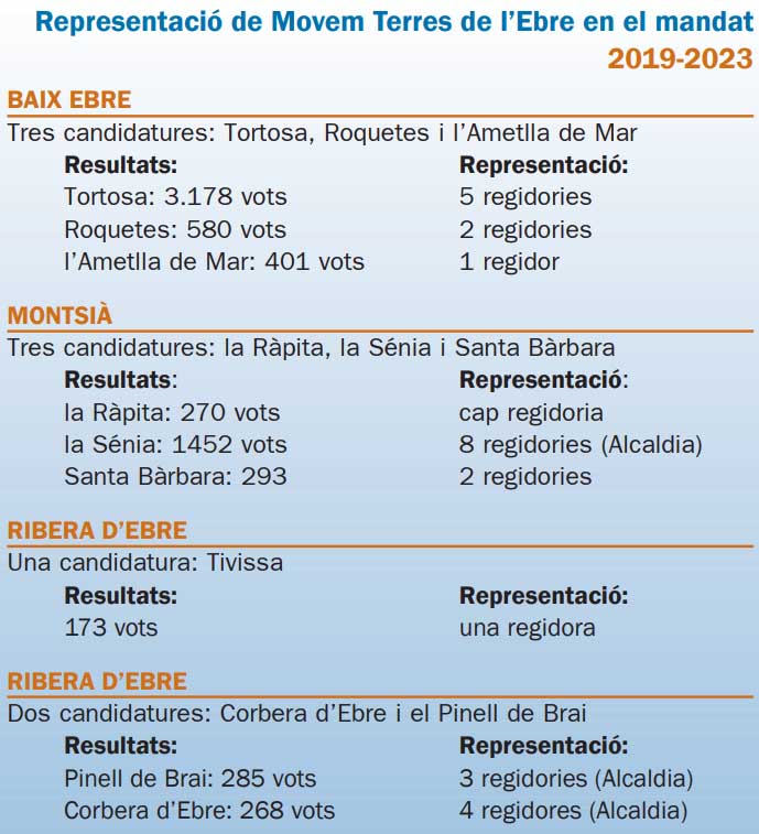 Movem Terres de l’Ebre afronta les eleccions municipals del maig com una data que pot marcar la plena consolidació del partit a nivell territorial i també local als ajuntaments de l’Ebre. Després que en les passades eleccions municipals nou candidatures es presentessen sota el paraigua de Movem, la formació es va constituir com a partit al gener de 2020, i ara afronta les eleccions com una revàlida per avalar la tasca dels governs i les agrupacions locals del darrer mandat.