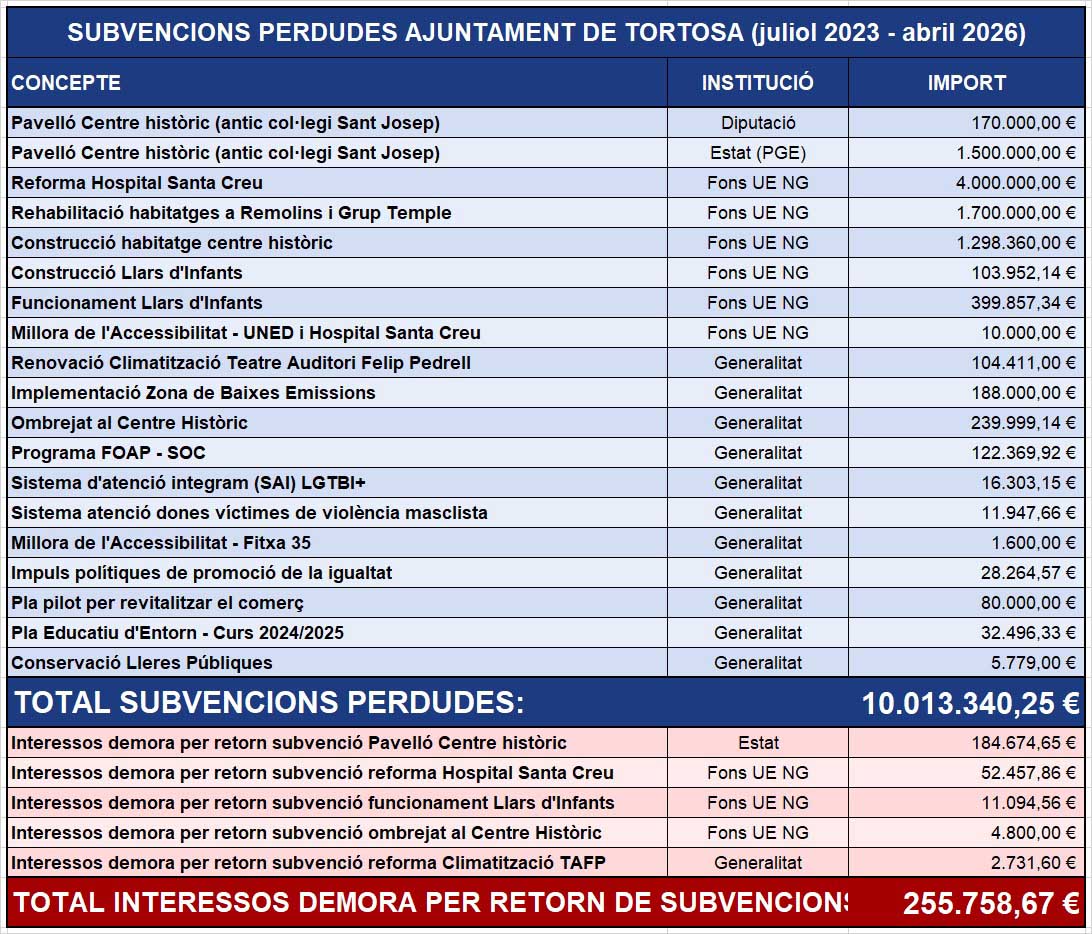 El grup municipal de Junts per Tortosa ha denunciat una nova pèrdua de recursos per part del govern municipal, en este cas, “per al finançament d’actuacions de planificació, millora i dinamització del comerç local“. En esta nova pèrdua, la quantia total acumulada de subvencions perdudes pel govern municipal “ja supera els 10 milions d’euros” segons Junts per Tortosa.