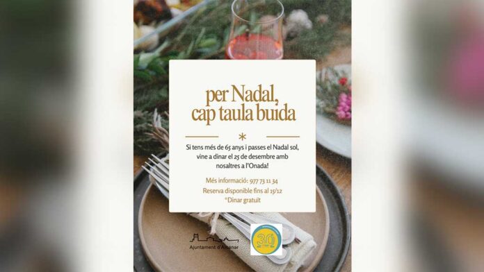 Amb les dates nadalenques a la vista, l’Ajuntament d’Alcanar llança la campanya “Per Nadal, cap taula buida”, una iniciativa amb l’objectiu de continuar fent arribar la màgia del 25 de desembre a totes les ciutadanes del municipi. L’acció, impulsada per la regidoria de Gent Gran i la d’Afers Socials i Famílies, permetrà que les persones de més de 65 anys que estiguen soles el dia de Nadal puguen anar a dinar de forma gratuïta a l’Onada, que es farà càrrec de l’àpat. Les reserves es podran fer fins al 15 de desembre trucant al 977 73 11 34.