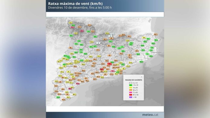 El Servei Meteorològic de Catalunya informa que els cops màxims de vent oscil·len al voltant dels 100 km/h en punts del litoral i prelitoral, amb dades fins a les 7 del matí d’este divendres.