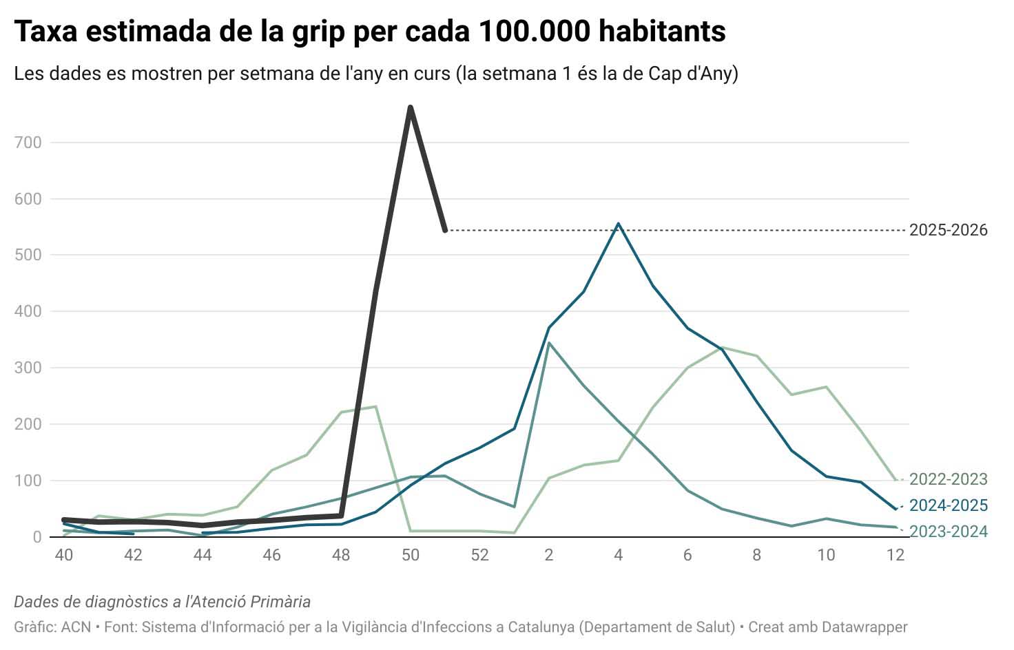 Després d’assolir un màxim de 486 casos de grip per cada 100.000 habitants (el 15 de desembre), la incidència de la grip ha començat a disminuir i se situa actualment en 327,48 casos per cada 100.000 habitants.