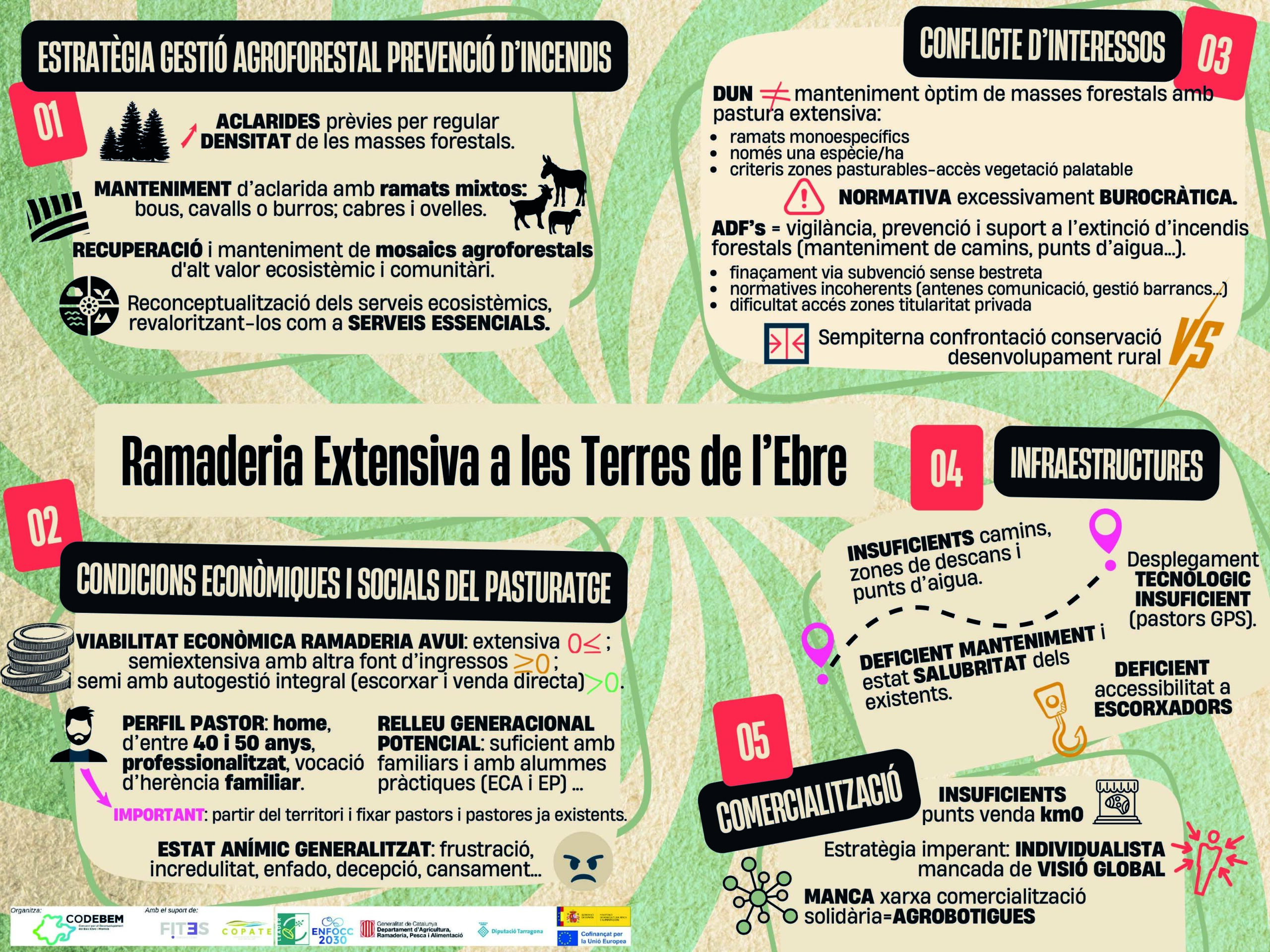 En paral·lel al documental, el CODEBEM i la cooperativa social FITES han elaborat una diagnosi sobre els efectes de la ramaderia extensiva i la prevenció d’incendis al Baix Ebre i al Montsià. L’informe situa la silvopastura (la gestió forestal mitjançant la pastura d’animals) al centre de les estratègies de futur i conclou que el maneig del bosc amb ramats és una de les aïnes més eficients per a reduir el risc i la intensitat dels grans incendis forestals.