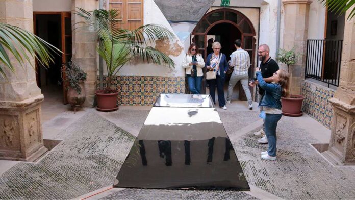 La distorsió entre la realitat i allò que somiem és el punt de partida de l’obra ‘Quimera’, dels mallorquins Adrian Thelen i Bartomeu Oliver, que han estat guardonats amb el premi del jurat a la 12a edició del festival A Cel Obert de Tortosa. La instal·lació d’art efímer s’exposa fins aquest diumenge al pati del monestir de la Puríssima Concepció Victòria, un espai que habitualment no és accessible a la ciutadania. Coincidint amb aquesta cita cultural, els dos arquitectes han optat per utilitzar una estructura en forma de piràmide invertida des d’on cau una gota d’aigua cada segon, que convida a reflexionar i badar a qui passa per davant. Precisament per donar protagonisme a l’espai on s’exposa, els dos joves han decidit fer servir miralls en aquesta obra, per “realçar” l’arquitectura que l’envolta i proporcionar “noves perspectives” de l’espai.
